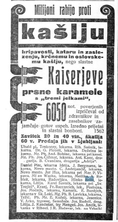 »…Na novo je prezidal svojo hišo g. lekarnar Hinko Brilli in sicer tako okusno, da se lahko reče, da je njegova hiša sedaj najlepša v Litiji. Vhod v lekarno je prestavil v vogal hiše, vrt pred lekarno, kterega je kupil od mesarja Lindnerja, je ogradil z lično betonsko ograjo. Ta zelenjadni vrt bo preuredil v okusen park, v katerem bo gojil eksotične rastline, tako da bo njegova lična hiša z vrtovi zares izgledala v japonskem slogu. Vzdolž vrta za Savo pa gradi škarpo v zavarovanje savskega nasipa ter bo izpeljal do Save širšo cesto, da bo dohod za napajanje živine, za perice ter eventualno postavitev brizgalne lažje…«